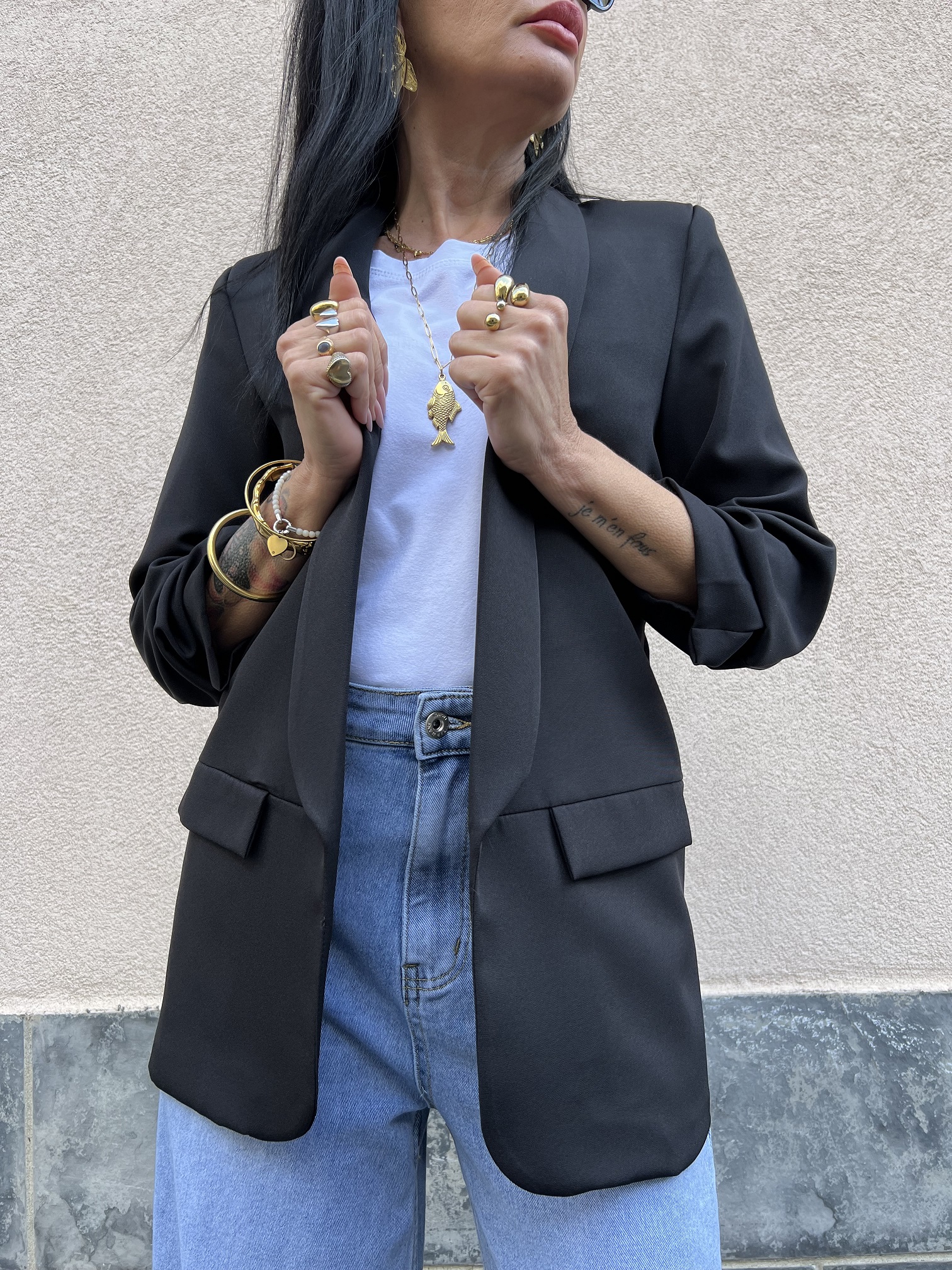• Blazer con manica arricciata a 3/4. Rimane aperto e non ha bottoni. Foderato in tinta.