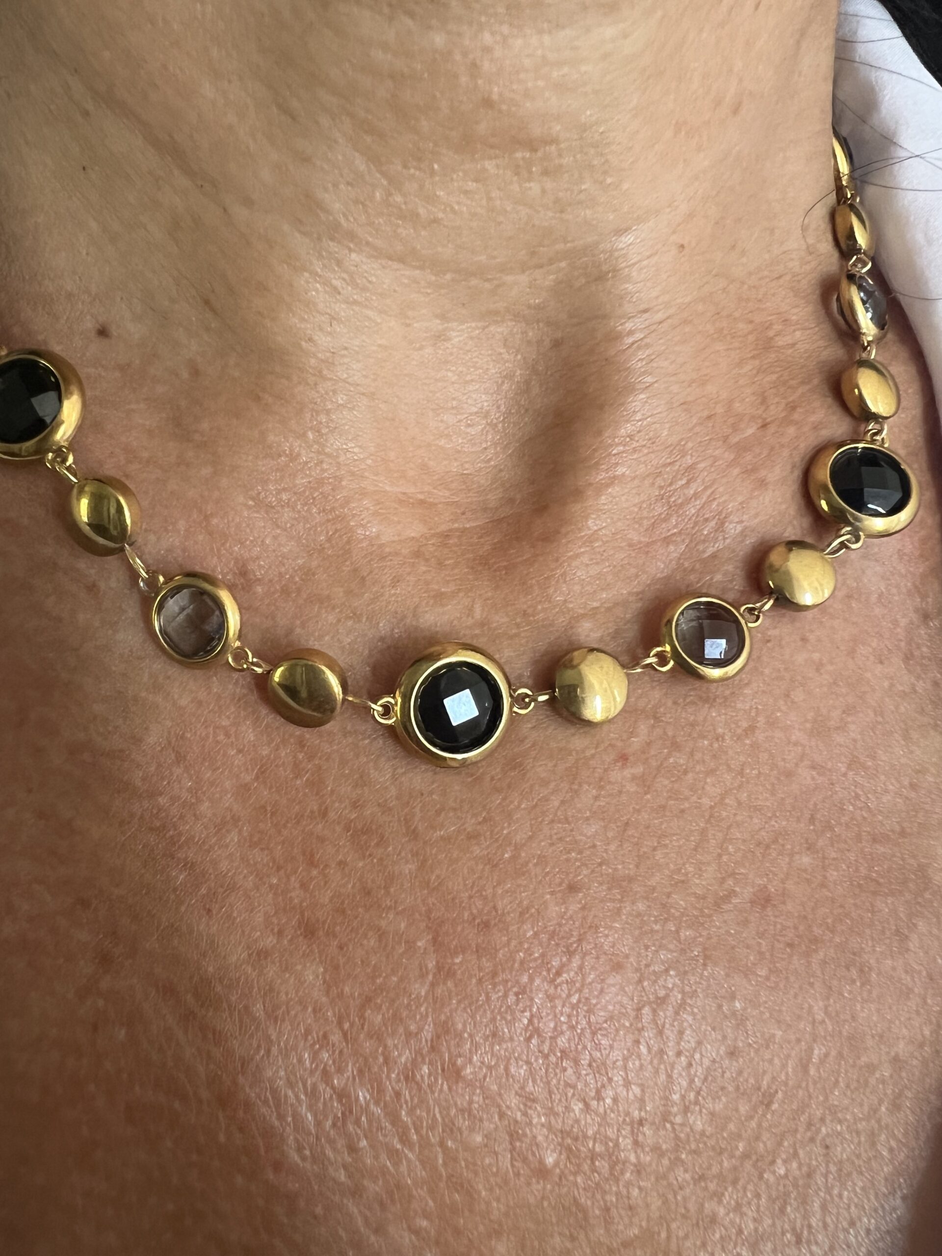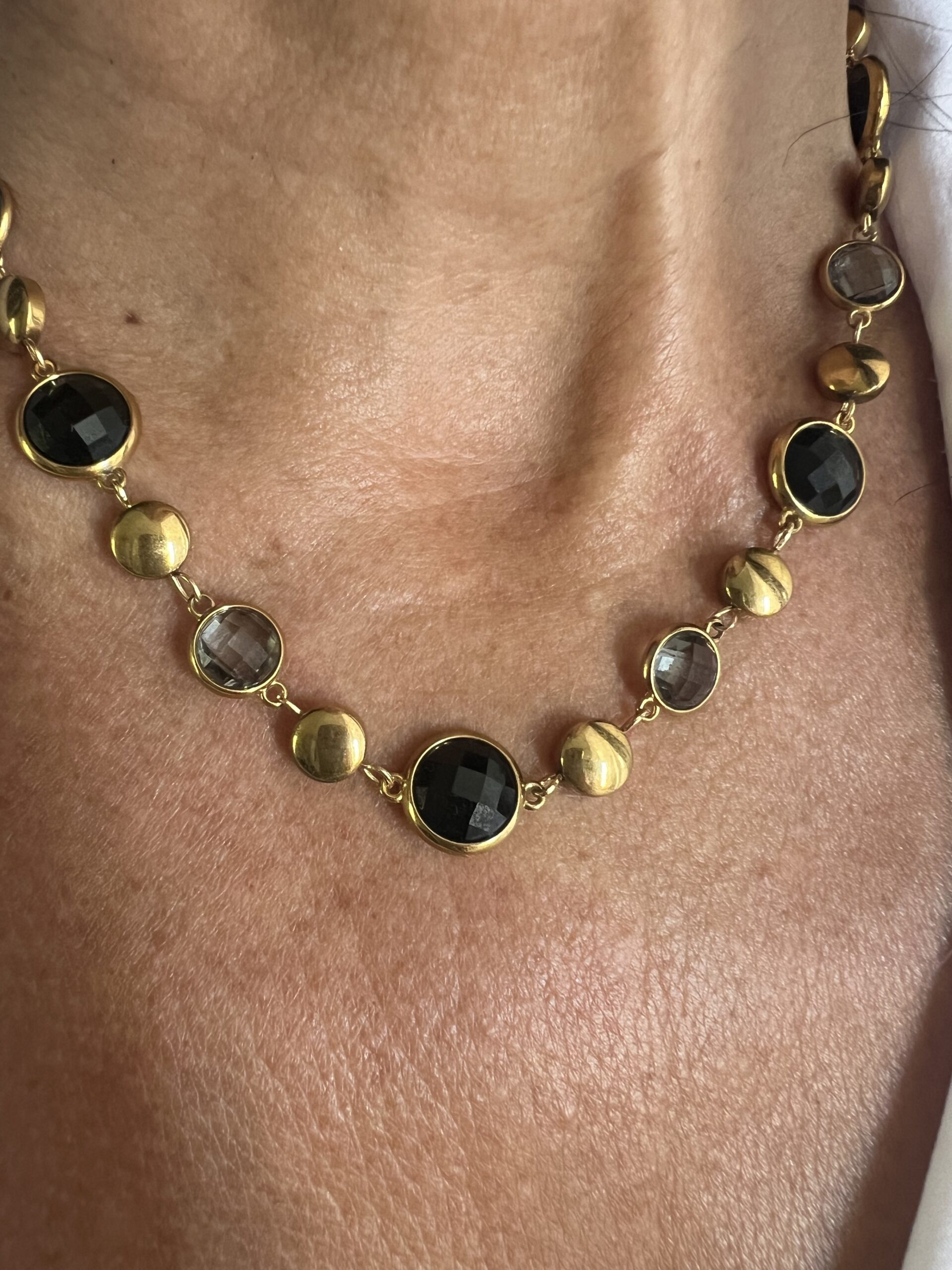 • Collana in acciaio inossidabile con pietre trasparenti nere e grigie sfaccettate.