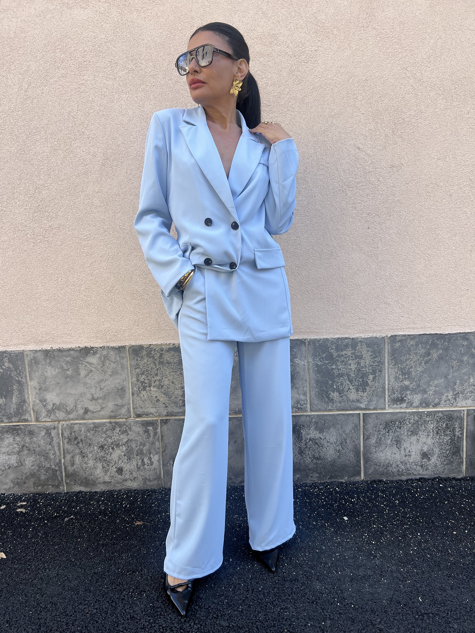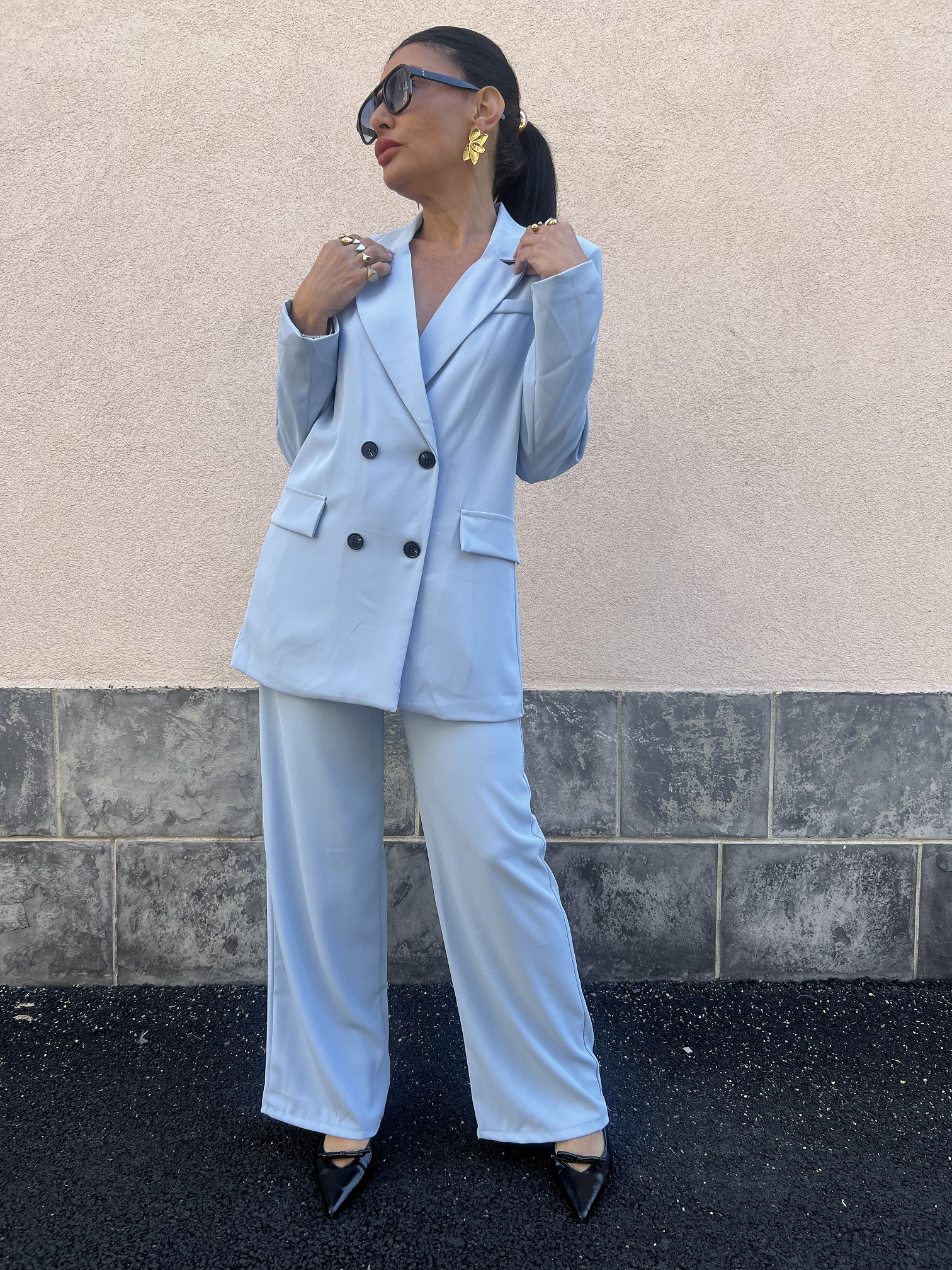 • Completo taglia unica, il blazer doppiopetto e foderato in tinta.